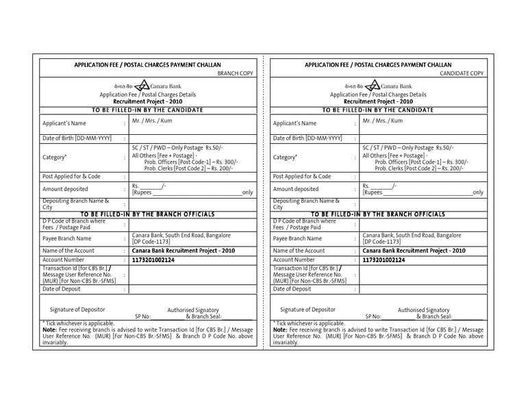 Canara Bank Clerk 2010 Challan Form Rupee Deposit Account