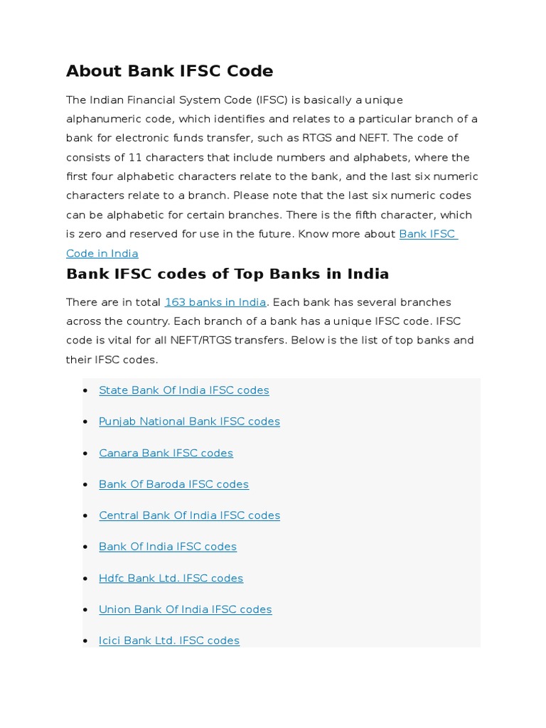 Top Ten Ifsc Code Branch Bank Of India