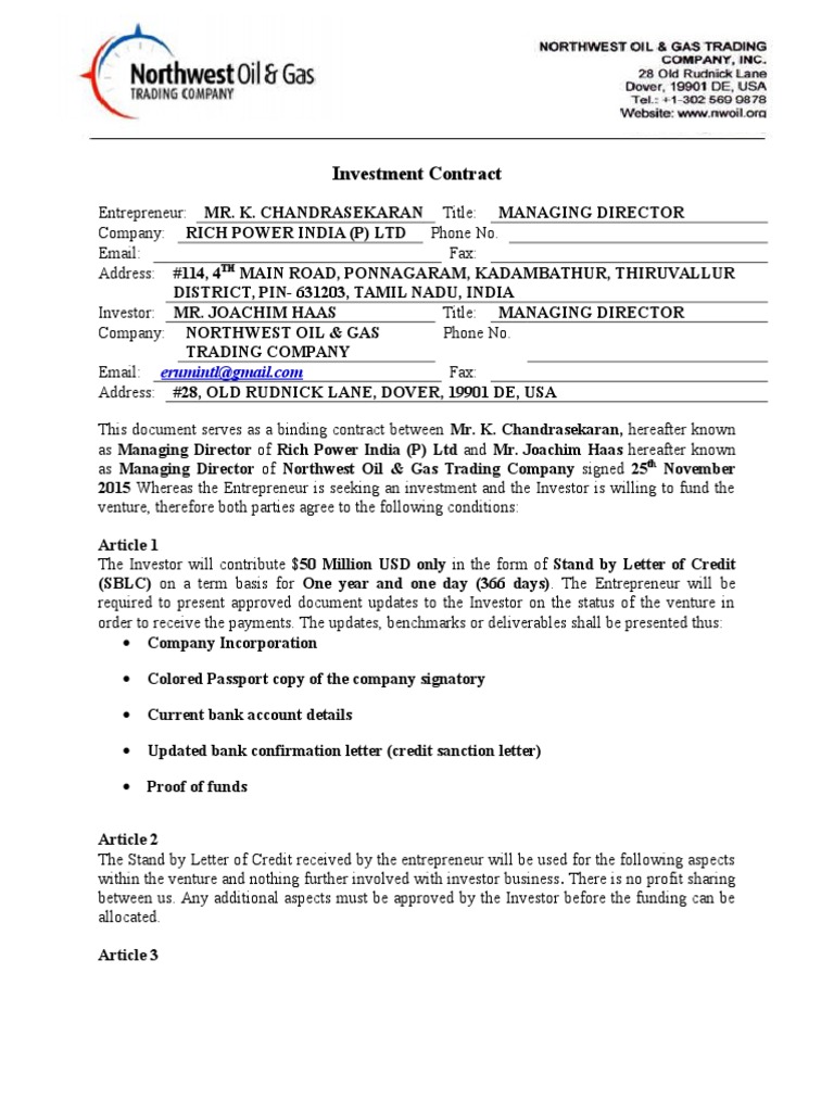 Investment Contract Investor Letter Of Credit Free 30 Day