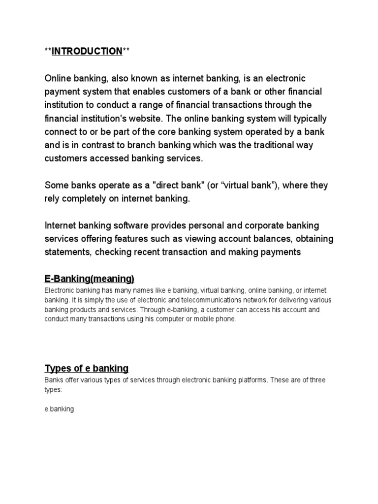 Types of e banking. The internet has emerged as one of the major distribution channels of banking products and services for the banks in us and in the european countries. A bank can be defined as an institution that accepts deposits from the public and gives out loans. Level 1 this is the basic level of service that banks offer through their websites.